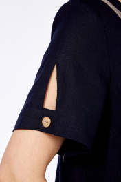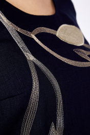 Платье женское прямого силуэта, изготовлено из натуральной ткани. Горловина круглой формы. По переду нагрудные вытачки. На спинке средний шов. В боковых швах обработаны карманы, внизу разрезы. Рукава втачные, разрезные с фигурным вырезом. Платье декорировано дизайнерской вышивкой. Длина платья по спинке — 129 см. р.50 — ПОГ 55 см, ПОБ 58 см. р.52 — ПОГ 57 см, ПОБ 60 см, р.54 — ПОГ 59 см, ПОБ 62 см, р.56 — ПОГ 61 см, ПОБ 64 см, р.58 — ПОГ 63 см, ПОБ 66 см, р.60 — ПОГ 65 см, ПОБ 68 см.