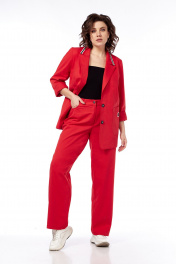Костюм брючный 2х — предметный, состоит из жакета и брюк, из костюмной ткани. Жакет прямого силуэта с воротником пиджачного типа, застежка однобортная на две петли с пуговицами. По переду обработаны рельефы и накладные карманы. Спинка со средним швом, в котором обработана шлица. Рукава втачные, двухшовные, дополнены отложной манжетой из отделочной ткани. Брюки средней посадки, прямые от бедра. Пояс притачной с застежкой на петлю и пуговицу. По передним деталям брюк обработаны карманы, которые дополнены декоративными элементами. Задние детали брюк на кокетке, имеются фигурные накладные карманы. Костюм по швам декорирован отделочными строчками. Длина жакета — 73 см, длина рукава — 62 см. р.52 — ПОГ 56 см ПОБ 60 см, р.54 — ПОГ 58 см ПОБ 62 см, р.56 — ПОГ 60 см ПОБ 64 см. Длина брюк по боковому шву — 108 см. р.52 — ПОТ 43 см ПОБ 56 см, р.54 — ПОТ 45 см ПОБ 58 см, р.56 — ПОТ 47 см ПОБ 60 см.
