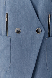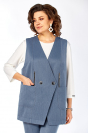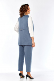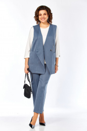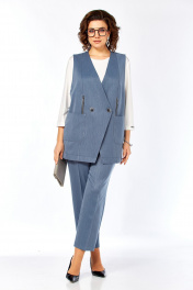 Костюм брючный 3х — предметный, состоит из жилета, лонгслива и брюк. Жилет и брюки выполнены из костюмной ткани, лонгслив из трикотажного вискозного полотна. Жилет прямого силуэта с двубортной застежкой на петлю и пуговицу. Горловина V-образной формы. По переду обработаны накладные карманы, в рельефах декоративные элементы с молниями. Спинка с фигурной кокеткой. Брюки свободного силуэта, с притачным поясом и вставками эластичной тесьмы. Застежка на петлю и пуговицу. В передних деталях брюк обработаны карманы с подрезным бочком. Лонгслив прямого силуэта, перед и спинка цельнокроеные, рукава втачные. Горловина обработана бейкой. Длина лонгслива по спинке — 62 см, длина рукава — 48 см. р.56 — ПОГ 57 см ПОБ 62 см, р.58 — ПОГ 59 см ПОБ 64 см, р.60 — ПОГ 61 см ПОБ 66 см. Длина жилета по спинке — 75 см. р.56 — ПОГ 60 см ПОБ 67 см, р.58 — ПОГ 62 см ПОБ 69 см, р.60 — ПОГ 64 см ПОБ 71 см. Длина брюк по боковому шву — 101 см. р.56 — ПОТ 45 см ПОБ 61 см, р.58 — ПОТ 47 см ПОБ 63 см, р.60 — ПОТ 49 см ПОБ 65 см.
