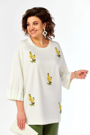 Комплект брючный двухпредметный, состоит из джемпера и брюк. Джемпер свободного силуэта выполнен из трикотажного полотна. Горловина обработана бейкой. Перед и спинка цельнокроеные. Рукава спущенные, по низу застрочены защипы . Джемпер декорирован дизайнерской вышивкой. Брюки классической посадки, выполнены из костюмной ткани. Пояс притачной , частично на эластичной тесьме, застежка на петлю и пуговицу. В передних деталях обработаны карманы с подрезным бочком. Длина джемпера по спинке -71 см, длина плеча + рукав — 61 см. р.58 — ПОГ 70 см ПОБ 68 см, р.60 — ПОГ 72 см ПОБ 70 см, р.62 — ПОГ 74 см ПОБ 72 см, р.64 — ПОГ 76 см ПОБ 74 см. Длина брюк по боковому шву — 103 см. р.58 — ПОТ 47 см ПОБ 62 см, р.60 — ПОТ 49 см ПОБ 64 см, р.62 — ПОТ 51 см ПОБ 66 см, р.64 — ПОТ 53 см ПОБ 68 см.