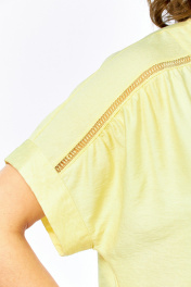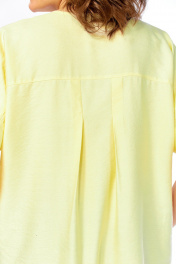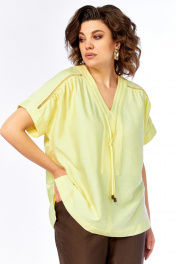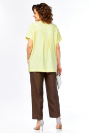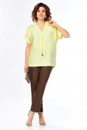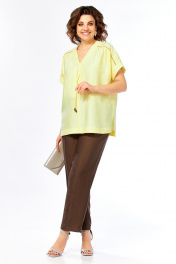 Костюм брючный двухпредметный, состоит из блузки и брюк. Выполнен из ткани с эффектом крэша. Блузка свободного кроя, горловина V-образной формы, с декоративной планкой в которой вставлен шнур с наконечниками. Полочка со сборкой от кокетки. По спинке кокетка и обработаны складки. Рукава цельнокроеные с притачными манжетами по низу . В боковых швах разрезы. Перед и спинка разной длинны. В качестве декора кружево в шве кокетки. Брюки свободного кроя. Пояс частично на резинке, застежка на тесьму-молнию и петлю пуговицу. По передним деталям брюк обработаны карманы в декоративных подрезах. Длина блузки по спинке — 74 см, длина плеча — 33 см. р.52 — ПОГ 60 см ПОБ 62 см, р.54 — ПОГ 62 см ПОБ 64 см, р.56 — ПОГ 64 см ПОБ 66 см, р.58 — ПОГ 66 см ПОБ 68 см. Длина брюк по боковому шву — 99 см. р.52 — ПОТ 40 см ПОБ 59 см, р.54 — ПОТ 42 см ПОБ 61 см, р.56 — ПОТ 44 см ПОБ 63 см, р.58 — ПОТ 46 см ПОБ 65 см.