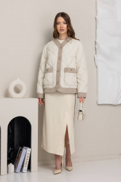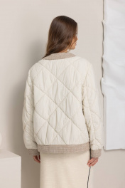 Кремовая стеганая куртка излучает элегантность и утонченность. Куртка имеет прямой силуэт и ромбовидную стежку, создающую интересный текстурный эффект. Контрастная отделка бежевым цветом по краю, на воротнике и карманах придает куртке особый шарм. Застежка на пуговицы добавляет классический акцент, а длина до бедер делает ее практичной и удобной в носке. Эта куртка идеально подойдет для создания стильного и элегантного образа в прохладную погоду.Длина изделия-54 см, длина рукава-63 см