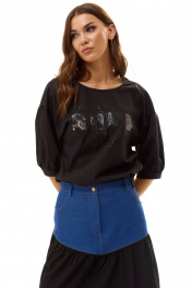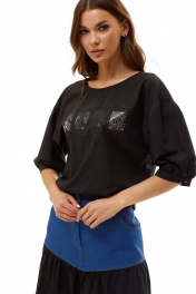 Блуза женская, прямого силуэта, со спущенной линией плеча. Перед декорирован авторским принтом. Рукав со сборкй по окату и манжетой по низу рукава, которая застегивается на петлю и пуговицу. Спинка со средним швом. Горловина округлой формы. Декоративные элементы и фурнитура могут отличаться от заявленных на фото. Длина изделия по спинке 63,5 см, длина рукава 45 см.