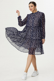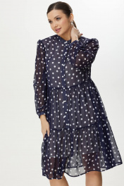 Платье женское, расширенное к низу, с завышенной линией талии. По переду обработана планка с застежкой на петли-пуговицы. Юбка платья состоит из двух ярусов. Горловина обработана воротником-стойкой. Рукав длинный, одношовный. Декоративные элементы и фурнитура могут отличаться от заявленных на фото. Длина изделия по спинке от горловины 100 см, длина рукава 61 см.