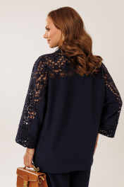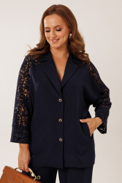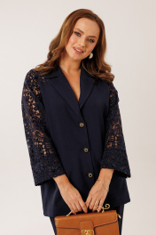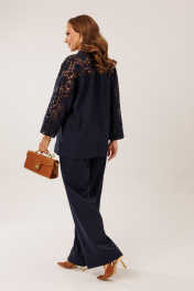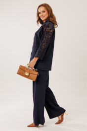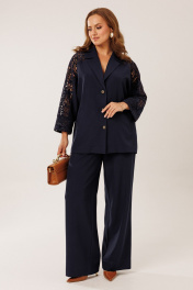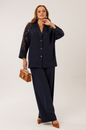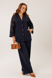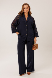 Костюм состоит из жакета с брюками. Жакет однобортный без подкладки, прямого силуэта с цельнокроеными рукавами. На полочках жакета обработаны наклонные прирезные карманы «в рамку» с листочкой. Кокетка полочки переходящая в кокетку спинки и верхнюю часть рукава из набивного гипюра в цвет основной ткани жакета. Манжета рукава так же из набивного гипюра. Спинка жакета прямая. Застежка на декоративные петли пуговицы. Горловина обработана втачным воротником с отрезной стойкой и лацканами. Брюки прямого силуэта от бедра с карманами в боковом шве. На передних половинках брюк заложены по 1 складке. По спинке брюк обработаны вытачки. Подгибка низа широкая. Застежка брюк на «молнию» в гульфике. Пояс брюк отрезной с частичной резинкой по спинке брюк.Цвет материала может отличаться по тону в зависимости от настроек вашего монитора! Длина жакета по спинке 46р. - 69,5 см, 52р. - 70 см, Длина брюк по боковому шву 111 см.