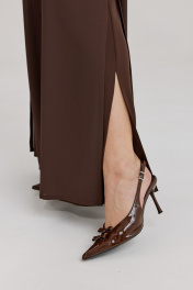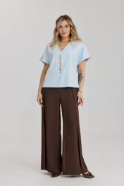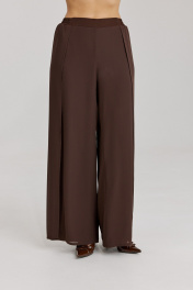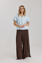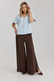 Брюки прямого силуэта, выполнены из шифоновой ткани на подкладке полной длинны. Боковой шов брюк открыт. Синка брюк заходит на перед по верхней части. Подкладка из не просвещающейся креповой ткани. Верх брюк обработан отрезным поясом. Центральная часть пояса без резинки, остальной пояс на резинке. Низ брюк обработан швом « в подгибку».