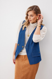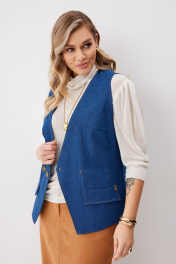 Жилет женский из джинсовой ткани на частичной подкладке. На передних половинках нагрудные вытачки и пропезные карманы с клапаном. Перед на подкладке, линия борта углом. Спинка с плечевыми вытачками имеет вырез по центру, с пояском по линии талии. Жилет застегивается на декоративные кнопки. Линия борта, горловины, вырез и низ на спинке отстрочен отделочными нитками. Длина спинки изделия 60,5 см