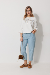 Джемпер женский прямого силуэта «летучая мышь» с округлой горловиной и спущенной линией плеча. По переду в области груди расположена авторская вышивка с пришивным декором. Рукав двухшовный 3/4 соединен с отрезным бочком полочки и спинки.