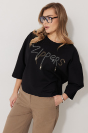Джемпер женский прямого силуэта «летучая мышь» с округлой горловиной и спущенной линией плеча. По переду в области груди расположена авторская вышивка с пришивным декором. Рукав двухшовный 3/4 соединен с отрезным бочком полочки и спинки.