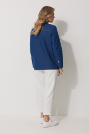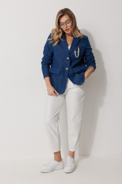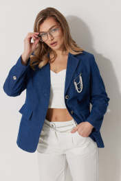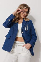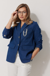Жакет женский прямого силуэта на частичной контрастной подкладке. Жакет однобортный, длинной до середины бедра с округлой формой борта. Полочка с отрезными бочками и вытачкой. В нижней части расположены прорезные карманы с клапаном. На левой полочке настрочен накладной карман. Спинка с отрезными бочками и отрезной кокеткой. Рукав втачной, полной длинны. По низу рукава обработана имитация шлицы с отделочными строчками и декоративными пуговицами. Воротник в жакете втачной с отрезной стойкой и лацканами. Жакет застегивается на петли и отделочные пуговицы. По воротнику, лацкану, борту, карманам и швам спинки и полочки прострочены отделочные строчки. Жакет декорирован съемной декоративной булавкой.