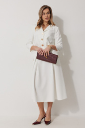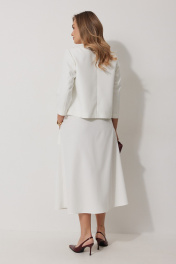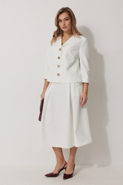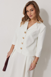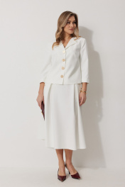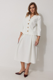 Костюм женский, состоящий из жакета и юбки. Жакет на подкладке, с рукавом и центральной однобортной застежкой на петли и декоративные пуговицы. Длина жакета до линии бедра. По переду обработаны наклонные вытачки. Спинка со средним швом. Горловина V-образной формы с отворачивающимися лацканами. Линия горловины обработана обтачкой. Рукав втачной, двухшовный ¾ длины. Юбка женская на подкладке А – силуэта длиной до середины икры. По переду юбки заложены встречные складки и нстрочены клапаны с декоративными пуговицами. Спинка юбки цельная. Карманы обработаны в боковом шве юбки. По левому боковому шву юбки находится застежка – молния. Верхний срез юбки обработан притачным поясом с резинкой по спинке. Длина спинки жакета 57 см, длина рукава 48 см, длина юбки по боковому шву 78,5 см.