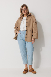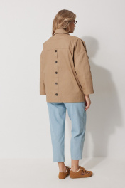 Жакет женский без подкладки прямого силуэта со спущенной линией плеча длиной за линию бедра. По переду жакета располагаются накладные карманы с цельнокроеным клапаном. Спинка с имитацией застежки по среднему шву и кокеткой. Рукав втачной одношовный прямой. По линии плечевого шва располагается пата со шлевками и пристегивается к рукаву на петлю и пуговицу. Перед жакета с центральной застежкой на цельнокроеные планки, застегивающиеся на петли пуговицы. Горловина обработана воротником рубашечного типа. Длина изделия по спинке 71 см, длина рукава 72,5 см.