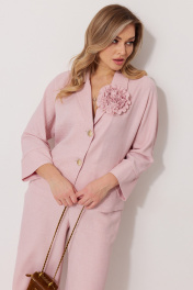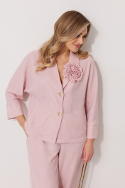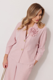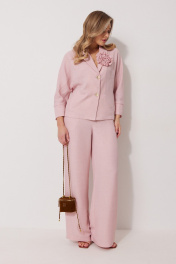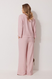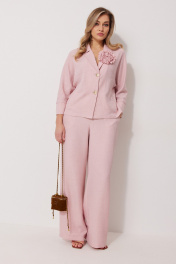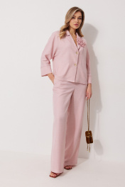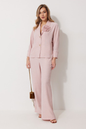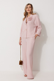 Костюм женский, состоящий из жакета и брюк. Жакет без подкладки, кроя «летучая мышь», с центральной однобортной застежкой на петли и пуговицы. По переду обработаны вертикальные прорезные карманы с листочкой. Спинка цельнокроеная, слева расположен декор в виде авторской броши. Горловина V-образной формы, обработана воротником пиджачного типа. Рукав 7/8, по низу обработан широкой притачной манжетой. Брюки женские, расширенные. По переду обработана застежка на молнию, обработаны карманы с наклонным входом. На задних половинках брюк застрочены вытачки. Верх обработан широким притачным поясом (частично на резинке), застегивающимся на петлю и пуговицу. Длина спинки жакета 58 см, длина рукава 66 см, длина брюк по боковому шву 109 см.