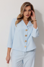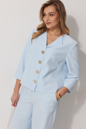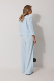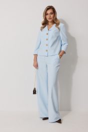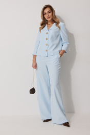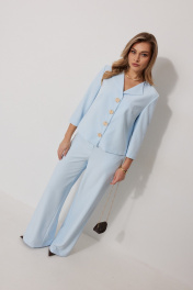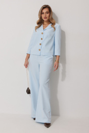 Костюм женский, состоящий из жакета и брюк. Жакет на подкладке, с рукавом и центральной однобортной застежкой на петли и декоративные пуговицы. Длина жакета до линии бедра. По переду обработаны наклонные вытачки. Спинка со средним швом. Горловина V-образной формы с отворачивающимися лацканами. Линия горловины обработана обтачкой. Рукав втачной, двухшовный ¾ длины. Брюки женские, прямого силуэта. По переду обработана застежка на молнию. Карманы наклонные с отрезным бочком. На задних половинках брюк застрочены вытачки. Верх обработан широким притачным поясом (частично на резинке), застегивающимся на петлю и пуговицу. Длина спинки жакета 56 см, длина рукава 48 см, длина брюк по боковому шву 109 см.