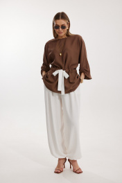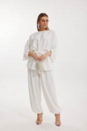 Брюки прямого силуэта с карманами в боковом шве и имитацией гульфика. Пояс притачной на резинке со шнуром в цвет отделочного канта. На задних половинках брюк застрочены вытачки. По низу брюки собраны на резинку.