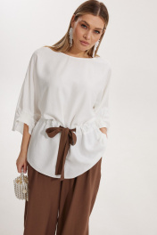 Костюм женский, состоящий из блузы и брюк. Блуза кроя «летучая мышь» длиной за линию бедра. Перед цельный с округлой горловиной. Спинка со средним швом. В районе талии обработана кулиса с широким контрастным поясом. По низу рукава по передней части выполнено несколько рядов сборки. Горловина обработана окантовкой. Брюки контрастного цвета прямого силуэта с поясом на резинке. По передним половинкам заложены складки и обработаны наклонные карманы с отрезным бочком По низу брюки собраны на резинку. Верхний срез брюк обработан отрезным поясом на частичной резинке.