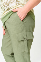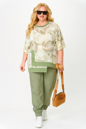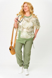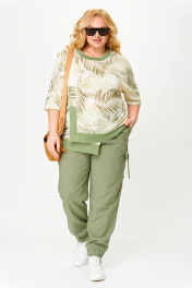 Комплект: джемпер,брюки. Джемпер выполнен из трикотажного полотна. Силуэт свободный. Покрой цельнокроеный, линия плеча спущена. Горловина округлая. По переду выполнен асимметричный элемент. Горловина, низ рукавов и низ изделия оформлены трикотажным довязом. Спинка со средним швом, без особенностей. Длина рукава от шва втачивания 42 см Длина изделия по спинке 72 см. Брюки выполнены из костюмной ткани. Покрой свободный. Силуэт прямой зауженный к низу при помощи резинки. Пояс классический притачной, частично на резинке в области боковых швов. Застёжка гульфик на молнию и пуговицу. В боковых швах наклонные карманы. Слева выполнен накладной карман с декоративной отделкой. По задним половинкам брюк отрезная кокетка и вытачки.