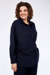 Комплект состоит из рубашки и брюк. Комплект выполнен из костюмной ткани в тонкую чуть заметную полоску. Рубашка свободного силуэта. Воротник рубашечный. Рукав со спущенной линией плеча, внизу обработан классической манжетой на 2 петли и пуговицы. Застёжка центральная на петли и пуговицы. По переду выставлена отлетная декоративная деталь - имитация половинки жилета. Спинка со средним швом, без особенностей. Брюки прямые. Пояс частично на резинке. Карманы в боковых швах. Длина рубашки по спинке 73 см Длина рукава 54 см Длина брюк по боковому шву от верхнего края пояса 106 см