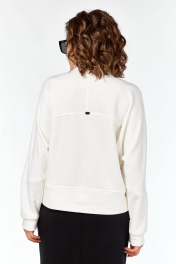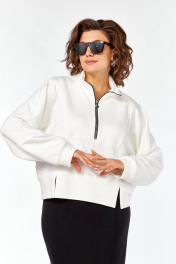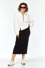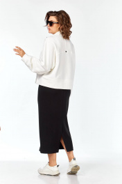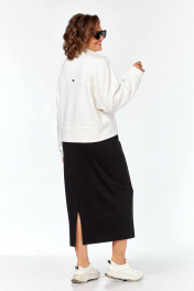 Комплект выполнен из высококачественного трикотажного полотна в сочетании 2ух цветов: Джемпер: свободного кроя,линия плеча спущена. Воротник мягкий стойка, застёжка на металлическую тесьму молнию. Низ джемпера обработан широкой бейкой с разрезами. Спинка с декоративными подрезами и металлической нашивкой. Юбка выполнена из высококачественного трикотажного полотна чёрного цвета. Силуэт прямой, слегла заужен к низу. Пояс на узкой резинке с декоративной нашивкой по центру спереди. По передней половине юбки застрочены канты. Сзади в среднем шве юбки шлица для хода. Юбка без застёжки, без подкладки.