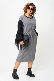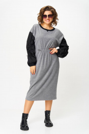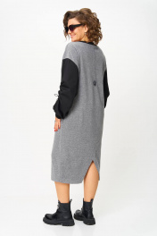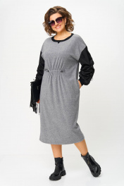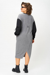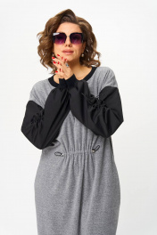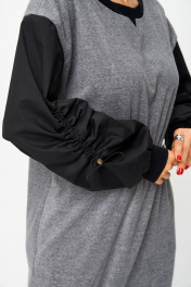 Платье женское, выполнено из комбинации трикотажного полотна и рубашечной ткани. Силуэт прямой, линия плеча спущена. Горловина овальная обработана трикотажным довязом. В области талии по переду частично кулиса с 2 мя стопперами и эластичным шнуром. Карманы в боковых швах. Спинка имеет декоративные элементы: защип, нашивку, фигурный подрез в нижней части юбки. Рукава платья выполнены из рубашечной ткани, широкие. Низ рукава на манжете из довяза. В шве рукава кулиса со стоппером и эластичным шнуром. Платье без застёжки, без подкладки.