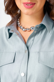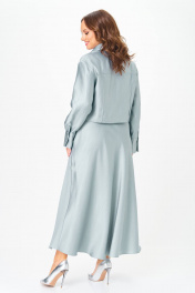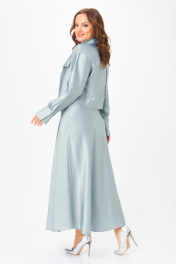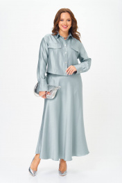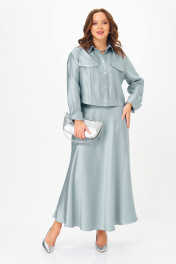 Костюм состоит из жакета и юбки. Выполнен из костюмной ткани с гладкой поверхностью с матовым блеском. Жакет укороченный без подкладки. Плечо чуть спущено. Воротник рубашечный. Рукав с широкой манжетой , застёжка на 1 пуговицу. По переду отстрочены вертикальные рельефы, декоративный клапан( имитация кармана). Застёжка центральная, на 5 кнопок. Спинка со средним швом, отрезной кокеткой, вертикальные рельефы отстрочены. Юбка расширена к низу. Пояс притачной на резинке.