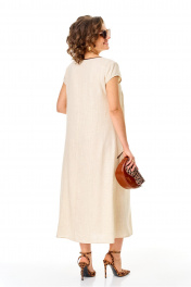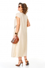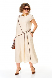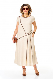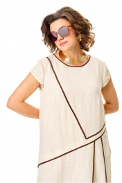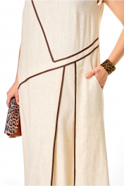 Платье выполнено из мягкого льняного полотна. Силуэт трапециевидный. В качестве отделки окантовка контрастным цветом по линиям подрезов. Спинка со средним швом , без особенностей . Платье без подкладки.