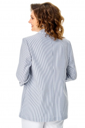 Комплект состоит из жакета и брюк. Жакет летний, без подкладки. Выполнен из ткани в тонкую полоску. Силуэт прямой, покрой рукава втачной. Застёжка центральная на 2 петли и пуговицы. Воротник пиджачный. Карманы накладные, правый карман декорирован нашивкой. Рукав длиной 3/4 , низ оформлен отворотом. Спинка прямая со средним швом . Брюк прямые, к низу чуть зауженные. Длина 7/8. Пояс притачной, частично на резинке. Карманы. Застёжка классическая на петлю и молнию( гульфик)