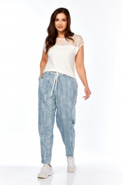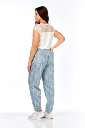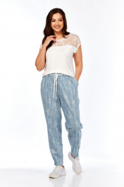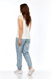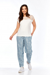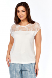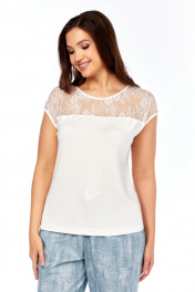Женский топ полуприлегающего силуэта, состоящий из 2-х видов тканей. Перед и спинка из вискозы, а кокетка переда и спинки из гипюра. Длина по спинке: 58см.