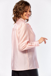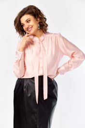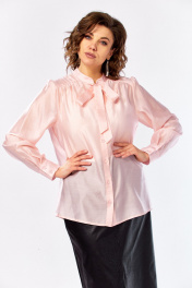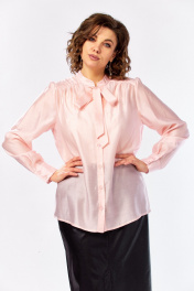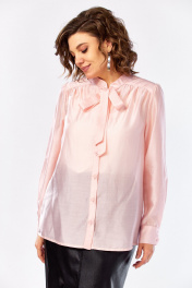 Женская блуза прямого силуэта, выполнена из блузочной ткани. По переду мягкая сборка, выходящая из отрезных кокеток.По спинке небольшая сборка по центру, выходящая из кокетки. Рукава втачные, со сборкой по окату, со складкой по низу рукава и отрезными манжетами на 2 петли и пуговицы. Воротник стойка с завязывающимся бантом. Застежка по переду на петли и пуговицы. Длина блузы: 67см. Длина рукава:63см.