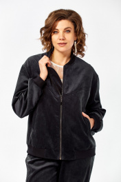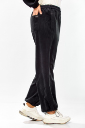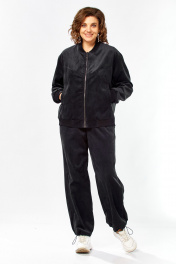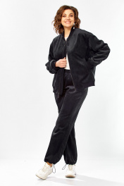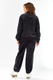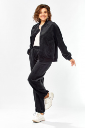 Костюм женский, состоящий из бомбера и брюк, выполнен из вильветовой ткани. Бомбер прямого силуэта, на подкладке. По переду фигурные кокетки, функциональные карманы с листочкой. По спинке средний шов. Горловина, низ и низ рукавов дополнены довязом "кашкорсе". Рукава двухшовные, собранные по локтевому шву. Застежка на молнию.Брюки свободные, прямые. По переду карманы в боковых швах, смещенных в сторону переда. Накладные карманы на задних половинках брюк. Пояс притачной, сосборен на эластичную резинку. Низ брюк обработан резинкой-затяжкой с фиксатором. Длина бомбера: 64см; длина рукава: 56см. Длина брюк: 103см.