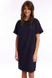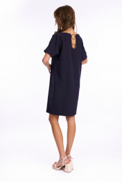 Платье женское свободного кроя, прямого силуэта с цельнокроеным рукавом. Горловина – лодочка. На левой стороне переда декоративное металлическое кольцо. Спинка с фигурным вырезом, украшена металлическими кольцами. Длина рукава от горловины - 29см Длина изделия - 90см