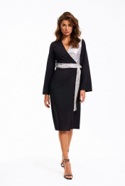 Платье женское малого объема, приталенного силуэта, с запахом по переду. Отрезное по линии талии. V-образный вырез горловины. Перед с фигурными рельефами, выходящими из проймы. Правая часть переда с отрезным фигурным поясом, выполненным из отделочного материала «пайетки». Левая часть переда полностью выполнена из отделочного материала «Пайетка». Спинка платья с двумя талиевыми вытачками. Юбка переда и спинки с талиевыми вытачками. Рукав втачной длинный, расклешенный к низу. Платье длиной ниже линии колена с притачным поясом (одна сторона выполнена из «пайетки»), который можно завязать на бант. Длина изделия - 118 см Длина рукава - 62 см