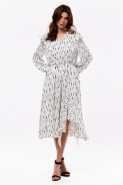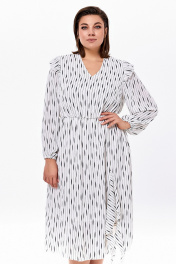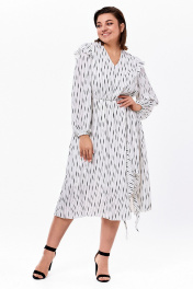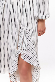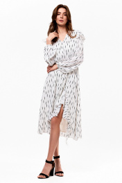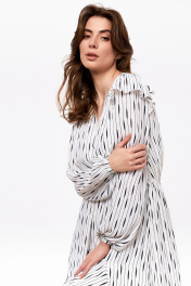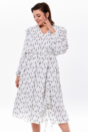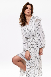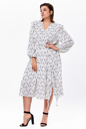 Платье из нежного штапеля на резинке по талии с расклешённой юбкой с разрезом по переду, обрамлённым воланом. Вырез горловины V-образный. Длинный рукав на резинке по низу и с рюшами по окату.