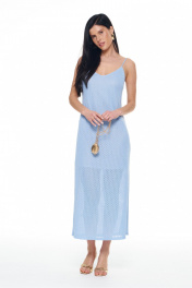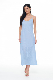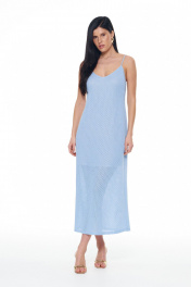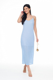 Платье на брителях, длинной миди, полуприлегающего силуэта. По переду наградные выточки. Ткань ткикотаж рыхлый вязки. Верх платья обработан трикотажной подкладкой. Низ пошшит на плоскошовной машине. Длина по среднему шву 42-52р - 73см.