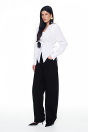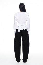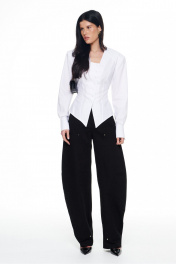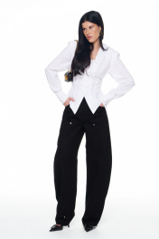 Брюки из плотного денима с выраженным объемом в области бедер и колен, сужающиеся книзу. Имеют сложные конструктивные членения с вертикальными рельефами, переходящими в коленные швы, что подчеркивает объемную форму. Спереди имеются классические карманы, сзади - накладные, прямоугольной формы. Притачной пояс со шлевками для ремня. Застежка на гульфик с молнией и пробивную металлическую пуговицу. По всем конструктивным швам (рельефам, входу в карманы, поясу, гульфику) проложены декоративные отделочные строчки. Длина брюк по боковому шву 42-44р - 112см 46-50р - 112.5см.