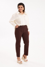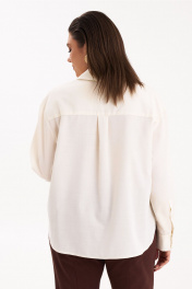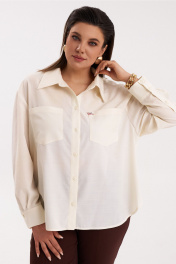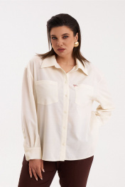 Базовая рубашка. Линия плеча спущена. Рукав длинный на манжете. По переду накладные карманы и застежка на петлю пуговицу. На кармане пришит декоративный элемент в виде птицы. Низ изделия фигурный.