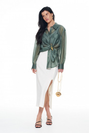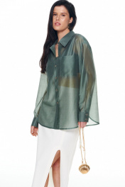 Рубашка прямого силуэта, удлиненная. Длинный рукав на манжете, линия плеча спущена, на спинке имеется кокетка. Горловина воротник стойка, на полочке имеется накладной карман. Застежка цельнокроеная планка на петли пуговицы. В комплекте имеется декоративная брошь. Длина по середине спинки: 44-48р - 73,5см. 50-54р - 78см. Длина рукава 44-48р - 59см. 50-54р - 60,5.