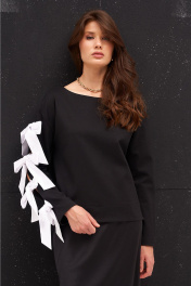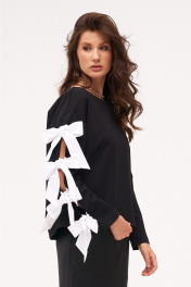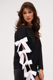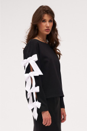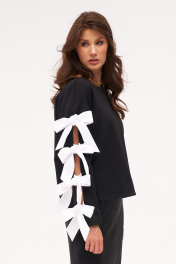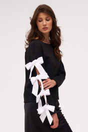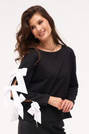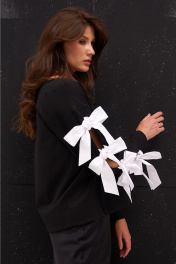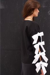 Джемпер из трикотажного полотна с хлопковыми бантами-завязками по рукаву. Боковые швы с разрезами внизу слегка перенесены на перёд.