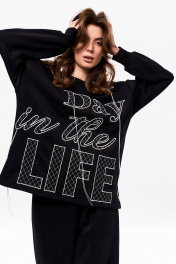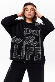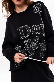 Объёмный джемпер из футера 3-х нитки с довязами на манжетах и по горловине. По переду контрастная вышивка. Брюки из футера 3-х нитки прямые от бедра. На резинке по талии и с контрастным шнуром. По переду отстроченные защипы.