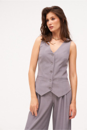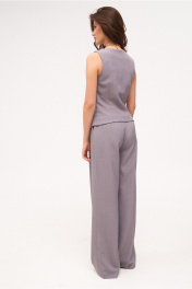 Женский костюм 2-ка состоящий из жилетки и брюк. Жилетка женская умеренного объема полуприлегающего силуэта. Перед с талиевыми вытачками и имитацией карманов с листочкой. Спинка с талиевыми вытачками. Жилетка на притачной подкладке. Застежка центральная, на прорезные петли и пуговицы. Длина жилетки до уровня линии бедер. Брюки женские большого объема, прямого силуэта, вида «палаццо». На передних половинках брюк по линии талии заложены две односторонние складки, направленные в сторону бокового шва и функциональные карманы с отрезным бочком. На задних половинках находятся по две талиевые вытачки. Пояс отрезной, притачной, с уступом на правой передней половинке. На поясе шлевки. Верхний край пояса расположен на естественной линии талии. Застежка брюк – классический гульфик. Застежка пояса на две пуговицы и две петли. Длина брюк в пол.