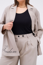 2-х предметный костюм, состоящий из жакета и брюк. Двубортный жакет прямого силуэта без подкладки со спущенной линией плеча и застёжкой на пуговицы. Справа по переду контрастный принт. По бокам разрезы. Брюки-палаццо прямого силуэта. На передних половинках брюк по линии талии заложены две односторонние складки, направленные в сторону бокового шва и функциональные карманы с отрезным бочком. На задних половинках находятся по две талиевые вытачки. Пояс отрезной, притачной. На поясе шлевки. Верхний край пояса расположен на естественной линии талии. Застежка брюк – классический гульфик. Застежка пояса на две пуговицы и две петли. Длина брюк в пол.