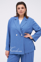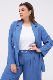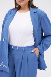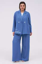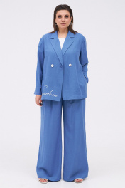 2-х предметный костюм, состоящий из жакета и брюк. Двубортный жакет прямого силуэта без подкладки со спущенной линией плеча и застёжкой на пуговицы. Справа по переду контрастный принт. По бокам разрезы. Брюки-палаццо прямого силуэта. На передних половинках брюк по линии талии заложены две односторонние складки, направленные в сторону бокового шва и функциональные карманы с отрезным бочком. На задних половинках находятся по две талиевые вытачки. Пояс отрезной, притачной. На поясе шлевки. Верхний край пояса расположен на естественной линии талии. Застежка брюк – классический гульфик. Застежка пояса на две пуговицы и две петли. Длина брюк в пол.