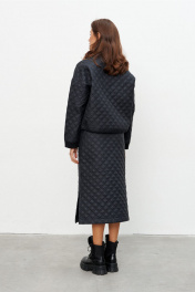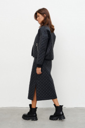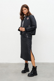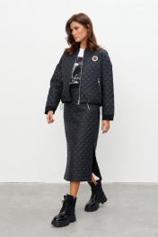 Комплект из стёганной плащёвки состоящий из бомбера и юбки миди. Бомбер с трикотажной стойкой по горловине и манжетами. По низу на кулисе со шнуром и фиксаторами. Спереди два кармана и застёжка на металлическую молнию. На груди слева настрочен декоративный шеврон. Юбка на трикотажном поясе с карманами по переду и застёжкой на потайную молнию сбоку. Снизу по бокам разрезы.