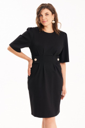 Приталенное платье из трикотажного полотна длиной до середины колена. По талии застрочены складки от которых идут декоративные паты с золотыми пуговицами. Рукав длиной до локтя с небольшими складками сверху. Застёжка на потайную молнию сзади. Длина 44-48р - 97 см, 50-54р - 99,5см. Длина рукава 44-48р -34см, 50-54р - 35см.