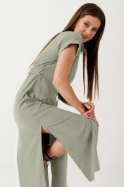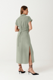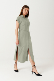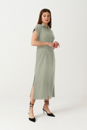 Платье из вискозной ткани для повседневной носки. Изделие полуприлегающего силуэта с коротким втачным рукавом. Воротник- стойка, застежка фронтальная на пуговицы. По переду встречные складки, по спинке вытачки. Для регулировке посадки по талии есть шнурок. Длина изделия до середины голени. В боковых швах разрезы от низа изделия.