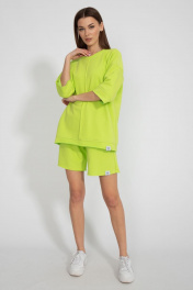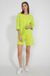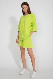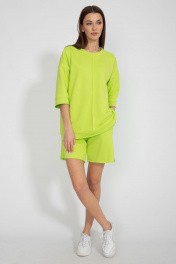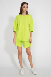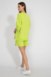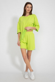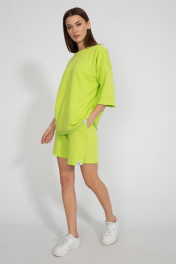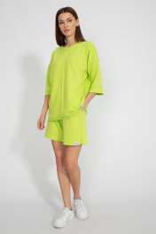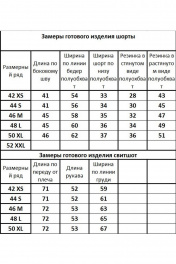 Комплект шорты и свитшот. Шорты женские средней посадки: карманы боковые в швах, низ без обработки, без шнурков. Свитшот оверсайз: необработанный край низа, с отделкой по центру переда. Ткань футер 3-х нитка. Только деликатная стирка 30 градусов, не использовать отбеливатели, изделие вывернуть наизнанку.