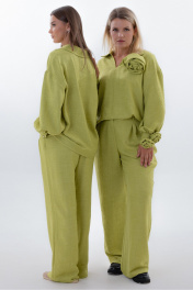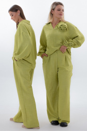 "Костюм со съемным декором Kivvi Wear — Гармония Свободы Kivvi Wear представляет идеальный дуэт, в котором элегантность встречается с безграничной свободой, это гармоничный ансамбль, где каждая деталь продумана для вашего комфорта и самовыражения. Блуза свободного кроя с отложным воротником и глубоким вырезом создает утонченную основу образа. Широкие рукава со сборкой на манжетах мягко ниспадают, добавляя пластичности каждому движению. Главная особенность — съемные декоративные цветы из основной ткани, которые позволяют разнообразить ваш образ: разместите их на груди или рукавах для романтичного акцента или уберите для лаконичной строгости. Брюки палаццо с высокой посадкой и скрытыми карманами продолжают философию комфорта и эстетики. Их струящийся силуэт визуально вытягивает линию ног, даря ощущение невесомости и легкости. Носите этот костюм как готовый ансамбль для создания цельного элегантного образа или комбинируйте вещи отдельно с другими элементами гардероба. Продуманный дизайн делает его актуальным для любого мероприятия."