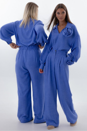"Костюм со съемным декором Kivvi Wear — Гармония Свободы Kivvi Wear представляет идеальный дуэт, в котором элегантность встречается с безграничной свободой, это гармоничный ансамбль, где каждая деталь продумана для вашего комфорта и самовыражения. Блуза свободного кроя с отложным воротником и глубоким вырезом создает утонченную основу образа. Широкие рукава со сборкой на манжетах мягко ниспадают, добавляя пластичности каждому движению. Главная особенность — съемные декоративные цветы из основной ткани, которые позволяют разнообразить ваш образ: разместите их на груди или рукавах для романтичного акцента или уберите для лаконичной строгости. Брюки палаццо с высокой посадкой и скрытыми карманами продолжают философию комфорта и эстетики. Их струящийся силуэт визуально вытягивает линию ног, даря ощущение невесомости и легкости. Носите этот костюм как готовый ансамбль для создания цельного элегантного образа или комбинируйте вещи отдельно с другими элементами гардероба. Продуманный дизайн делает его актуальным для любого мероприятия."