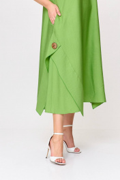Элегантное женское платье из ткани с эффектом легкого крэша. Силуэт расширенный к низу. В боковых швах карманы. Вырез горловины круглый. Рукав короткий. Оригинальность платью придают отлетные декоративные детали по низу платья, придающие платью пышность. В качевстве декора использованы крупные декоративные пуговицы и украшение.