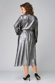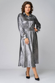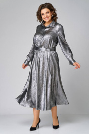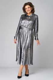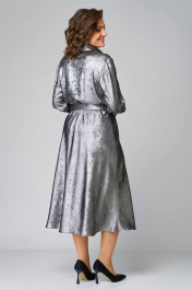 Нарядное женское платье из ткани с добавлением вискозы и шелка с блестящим эффектом. Отрезное по талии с небольшой сборкой на резинке и удлиненной юбкой на подкладке. Лиф свободного облегания с центральной потайной застежкой на пуговицы, воротник рубашечного типа, рукав длинный с отворачивающимся манжетом, пояс съемный на полукольцах.
